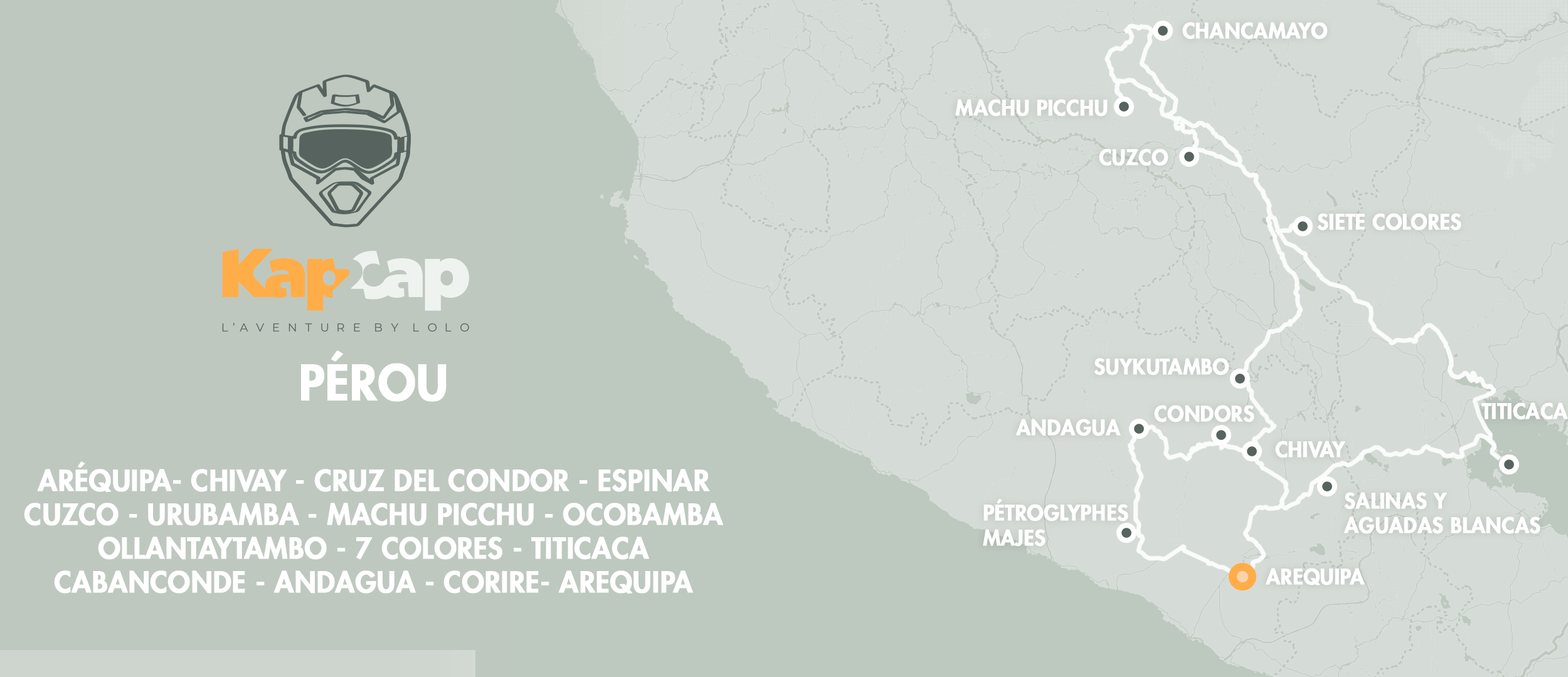 2.600 kilomètres, à moto, à quatre, en famille, sur 2 Royal Enfield de l’Agence Vintage Rides, chargées comme des mules. Ces 21 jours de “vacances” au Pérou n’auront pas été vraiment de tout repos ! Bien sûr, il y a eu le Machu Picchu, le lac Titicaca, la Vallée Sacrée, mais il y a eu, aussi et surtout, le Canyon de Colca , la Vallée des Volcans, le fameux Soroche (le mal des montagnes), les condors, la montagne aux 7 couleurs, plusieurs cols à 5.000 mètres d’altitude au cœur de la Cordillère des Andes, la feuille de coca savamment mastiquée et tant de choses que le mieux… reste encore de te plonger dans ce voyage découpé en plusieurs étapes. Un voyage que tu pourras d’ailleurs réaliser avec Vintage Rides qui nous a prêté les motos, mais aussi fourni des tonnes d’infos sur le pays, les pistes à emprunter, avant de nous laisser voler de nos propres ailes. Pour plus de confort, un guide, un véhicule d’assistance et aussi pour voyager en petit groupe, n’hésite surtout pas à faire appel aux services de Vintage Rides.